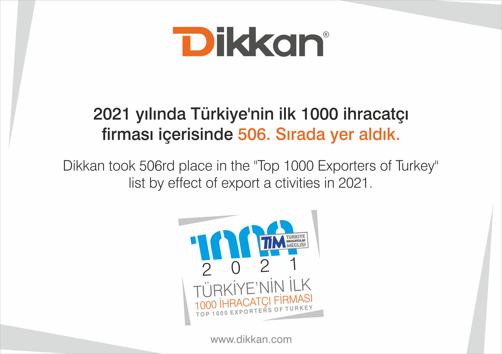 Dikkan olarak 2021 yılında gerçekleştirdiğimiz dış ticaret hacmimiz ile Türkiye ekonomisine yarattığımız katkıdan dolayı gurur duyuyoruz.